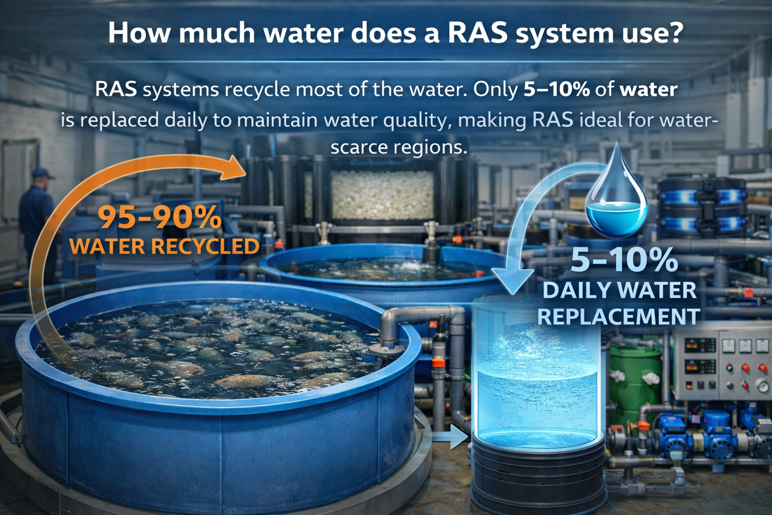 RAS systems recycle most of the water. Only 5–10% of water is replaced daily to maintain water quality, making RAS ideal for water-scarce regions.
